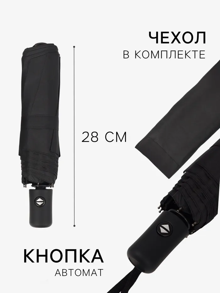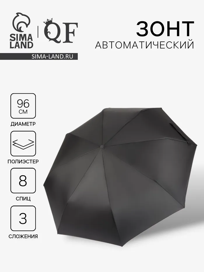 Зонт автоматический «Однотон», 3 сложения, 8 спиц, R=48/55 см, d=96 см, чёрный — Характеристики