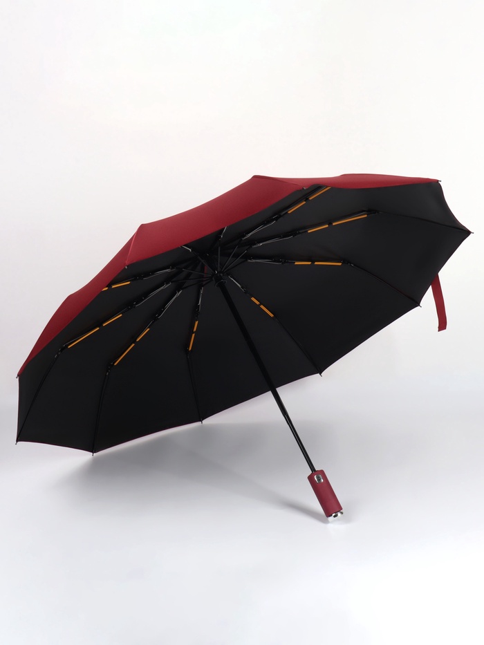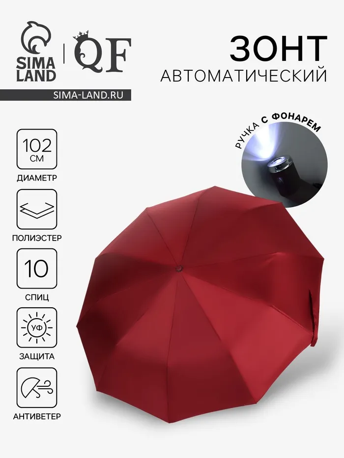 Зонт автоматический «Однотон», с фонарем, 3 сложения, 10 спиц, R=51/58 см, D = 102 см, бордовый — Характеристики