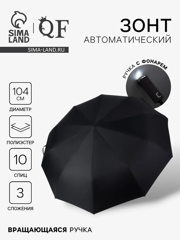 Зонт автоматический «Однотон», с фонариком, вращающаяся ручка, 3 сложения, 10 спиц, R=52/60 см, d=104 см, чёрный — Характеристики