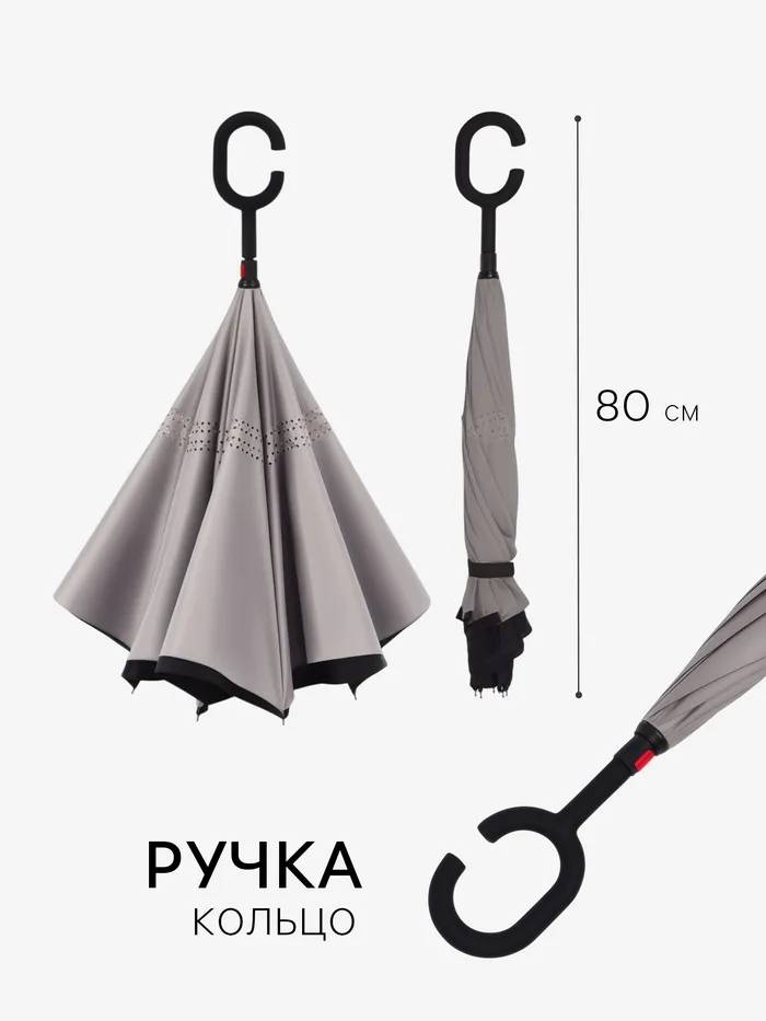 Необычный зонт будет Вашим верным помощником в дождливю погоду. Система данного зонта - механическая. От других моделей отличается механизмом обратного сложения. Зонт закрывается мокрой сторой внутрь. Конструкция задерживает воду в себе. При необходимости Вы легко сможете убрать зонт в сумку или на сидение автомобиля. Мокрых следов не останется! Купол зонта состоит из полиэстра. Потрясающая ручка удобно лежит в руке.