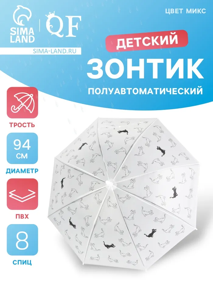 Зонт - трость детский «Кот», полуавтоматический, 8 спиц, R=47/54 см, d=94 см, МИКС — Характеристики