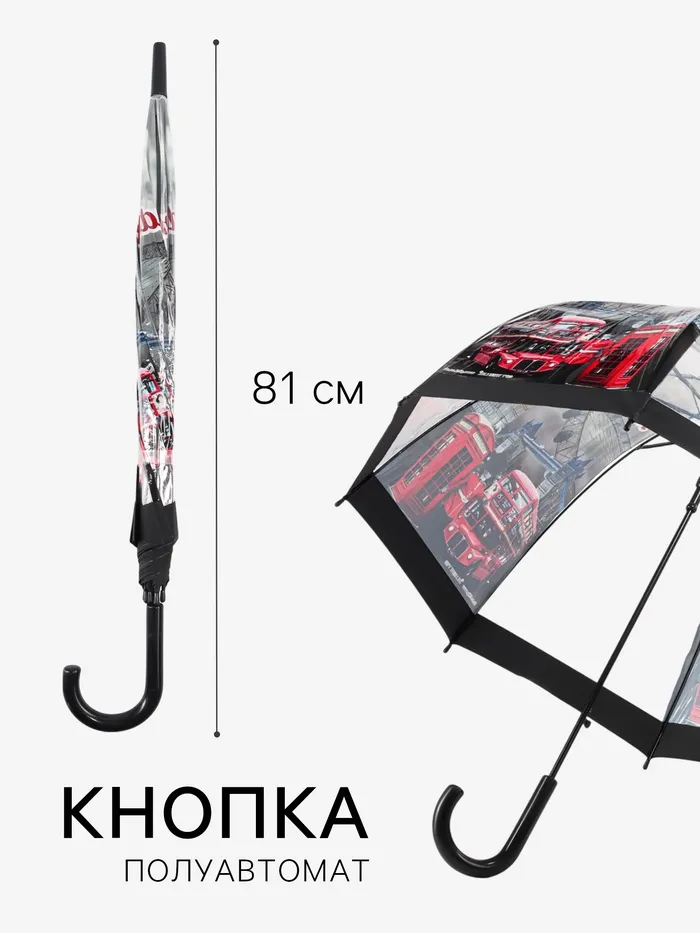 Зонт - трость полуавтоматический «Город», 8 спиц, R=39/58 см, d=78 см, прозрачный, чёрный — Характеристики