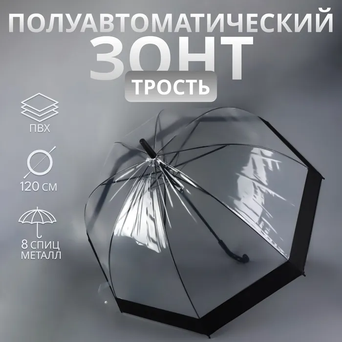 Зонт - трость полуавтоматический «Кант», 8 спиц, R=43/60 см, d=86 см, чёрный, прозрачный — Характеристики