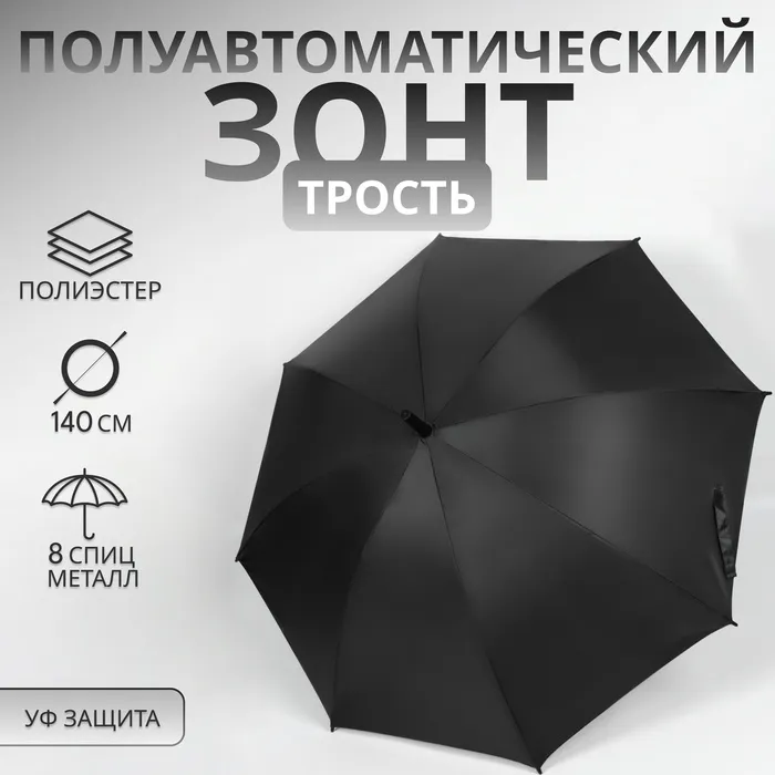 Зонт - трость полуавтоматический «Однотонный», 8 спиц, R = 58/70 см, D = 140 см, цвет чёрный — Характеристики