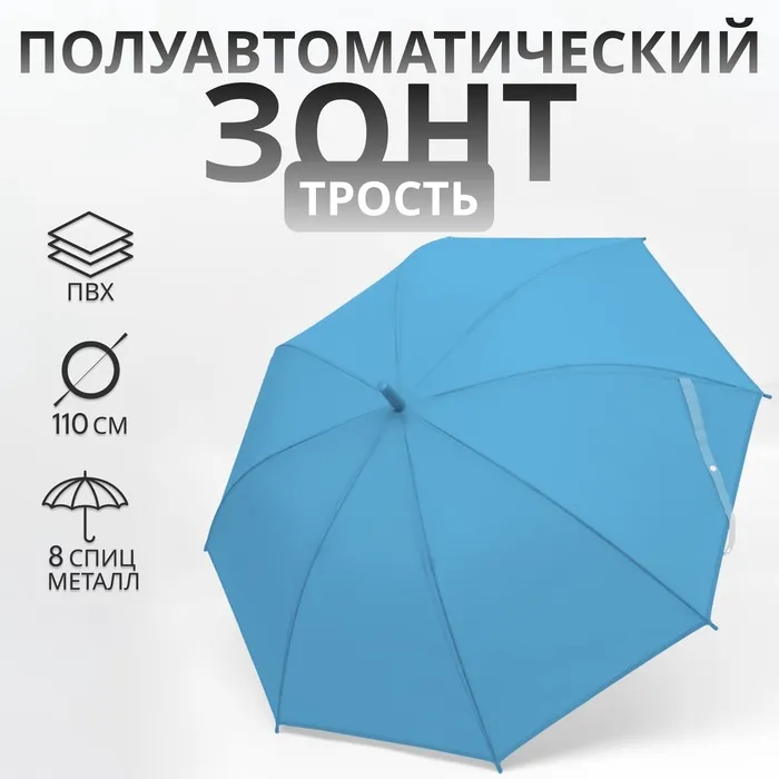Зонт - трость полуавтоматический «Однотонный», 8 спиц, R=47/55 см, d=94 см, синий — Характеристики