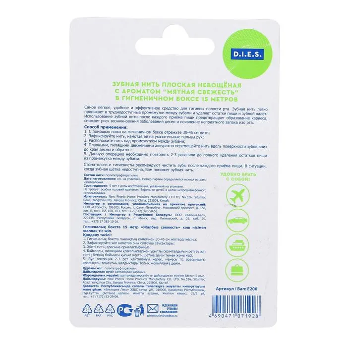 Зубная нить D.I.E.S. не требует особых условий хранения и подходит для любого типа зубов и дёсен.