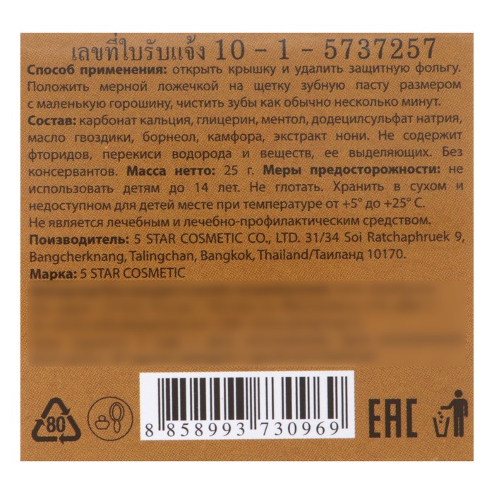 Состав: карбонат кальция, глицерин, ментол, додецилсульфат натрия, масло гвоздики, борнеол, камфора, экстракт нони.