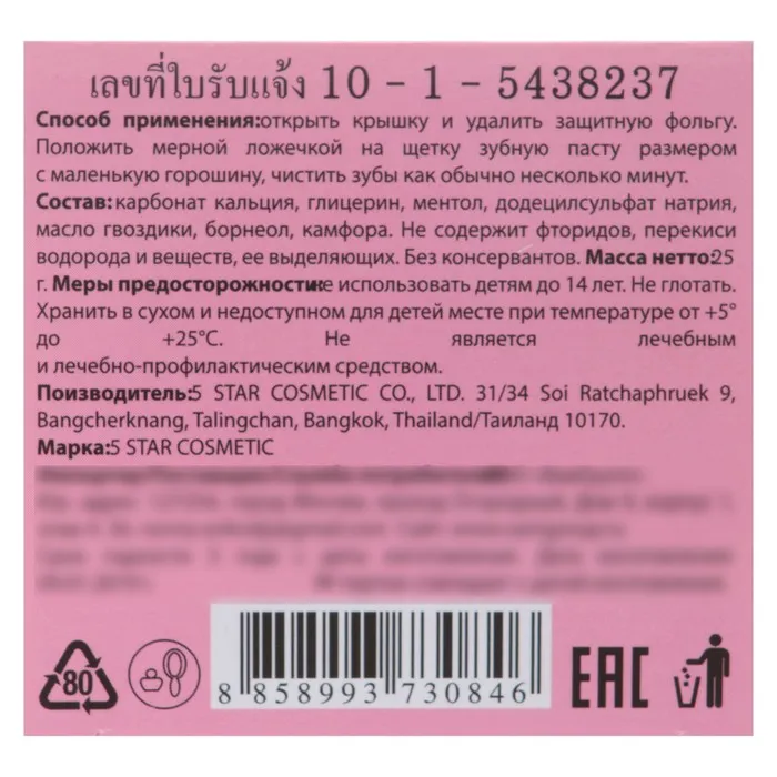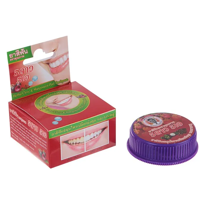 Зубная паста 5 Star Cosmetic с травами и гвоздикой — это натуральный продукт, который бережно отбеливает зубы, освежает дыхание и предотвращает возникновение кариеса и пародонтоза. В состав пасты входят карбонат кальция, глицерин, додецилсульфат натрия, ментол, камфора, масло гвоздики и борнеол.