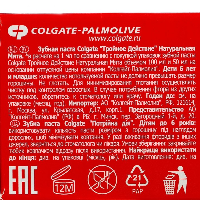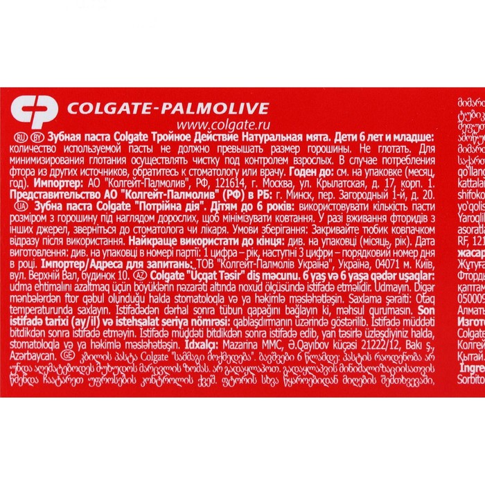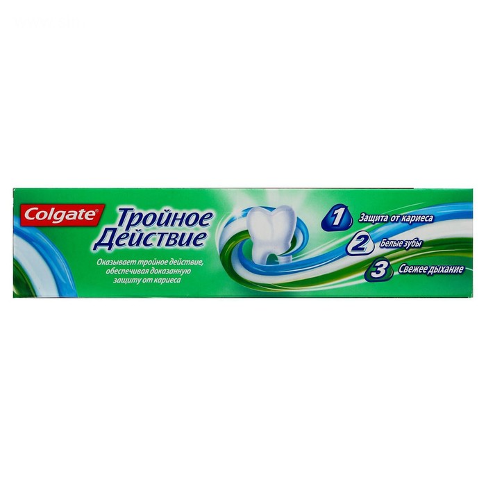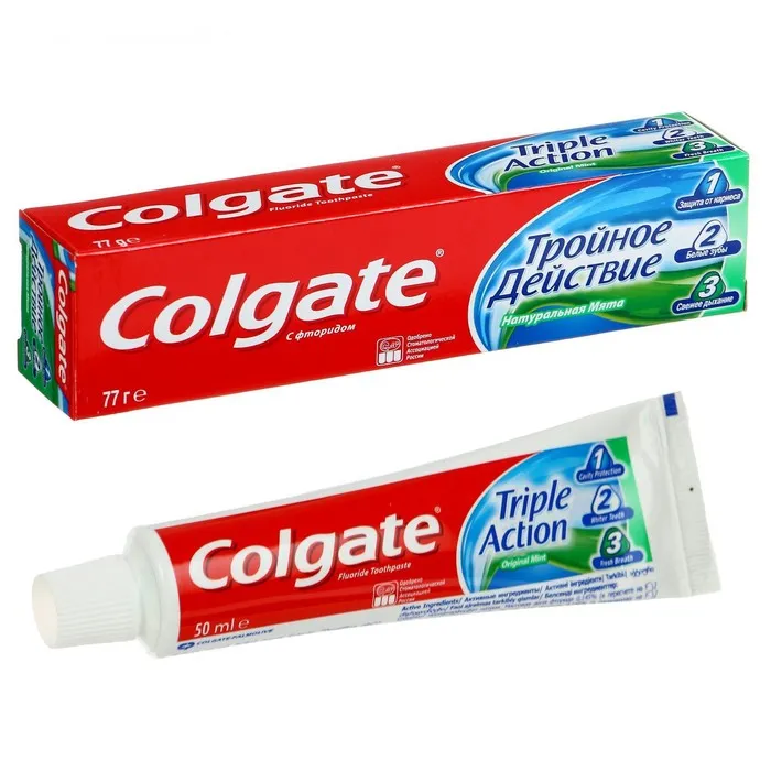 Зубная паста обеспечивает максимальную защиту от кариеса. Эта трехцветная зубная паста оказывает тройное действие: помогает защищать зубы от кариеса, помогает удалять потемнения с поверхности зубов и освежает дыхание. Что немаловажно, Colgate Тройное Действие обладает приятным мятным вкусом.