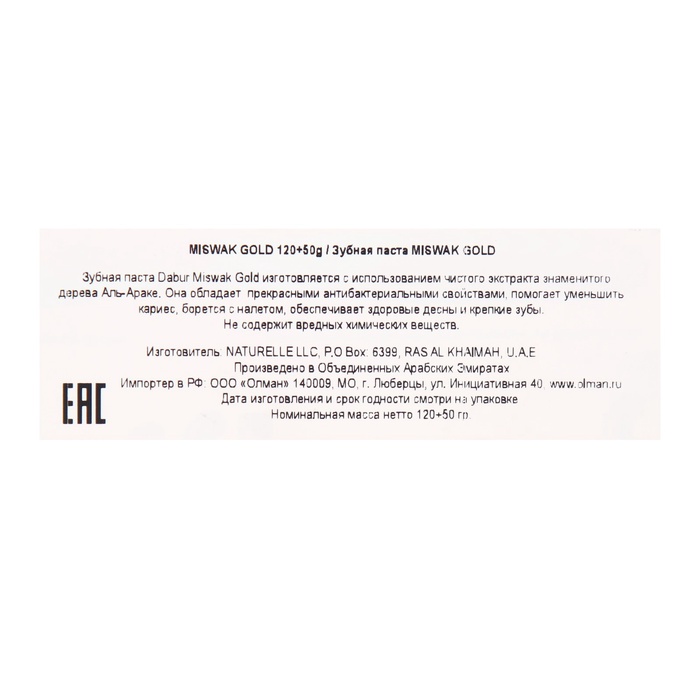 Аюрведическая зубная паста Miswak не содержит фтора и придает свежее дыхание, эффективно очищает зубы от налета и остатков пищи, оказывает лечебное воздействие. Она устраняет кровоточивость десен и является профилактическим средством для борьбы с кариесом. Паста создана с применением лакричного дерева, которое использовалось для чистки зубов веками.