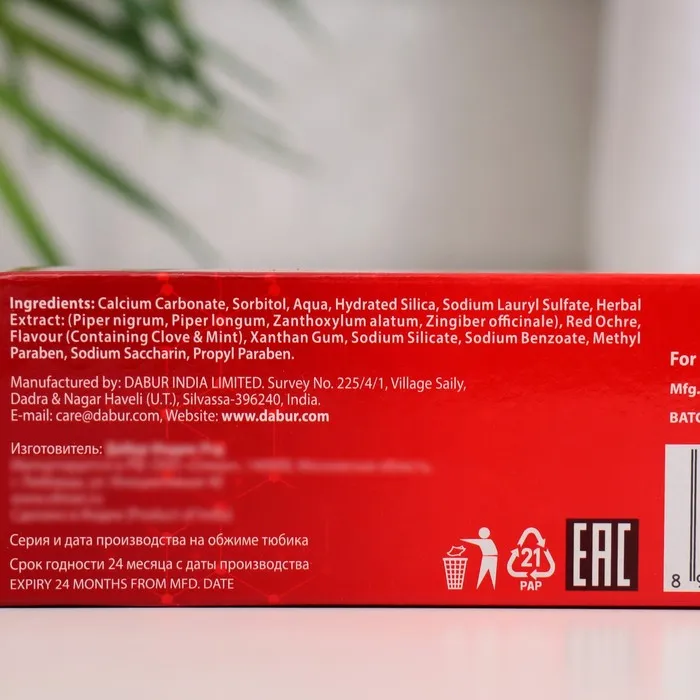 Основные преимущества и элементы зубной пасты Dabur Red: натуральный состав (никаких красителей и консервантов). Безопасно для эмали зубов. Мягкая защита полости рта. Широкое антисептическое воздействие, приводящее к прекращению в полости рта инфекционных заболеваний. Гвоздика предотвращает разрушение зубов. Мята оказывает противогрибковое и антибактериальное действие. Корень сутхи - антибактериальное и противовоспалительное средство. Длинный перец (пиппали) и чёрный перец освежают дыхание, являются антибактериальными средствами. Лаванга - облегчает зубную боль. Томар - антисептик, также освежающий дыхание.- Камфора - местный анальгетик, антисептик.- Карпура - анальгетик, антисептик. Харитаки - вяжущее средство, помогающее при стоматите. Марича освежает дыхание, является антибактериальным средством.