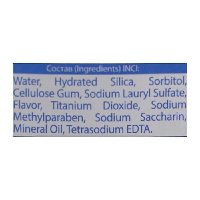 Состав: Aqua (Water), Hydrated Silica, Sorbitol, Cellulose Gum, Sodium Lauryl Sulfate, Parfum (Flavor), Titanium Dioxide, Sodium Methylparaben, Sodium Saccharin, Mineral Oil, Tetrasodium EDTA.