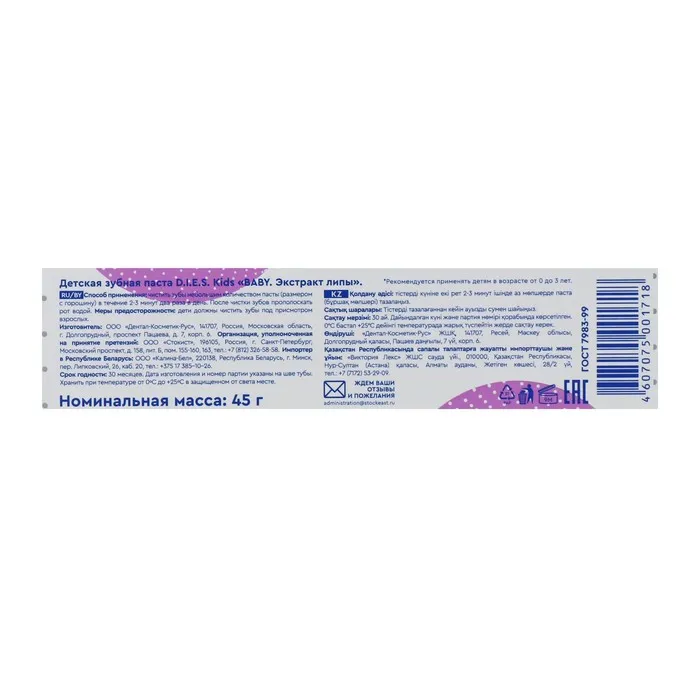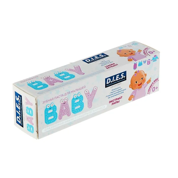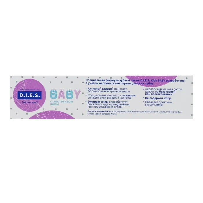 Специальная формула зубной пасты D.I.E.S. Kids Baby с экстрактом липы разработана с учетом особенностей первых детских зубов. Активный кальций помогает формированию крепкой эмали. Специальный комплекс с ксилитом снижает риск развития кариеса. Экстракт липы способствует снижению зуда и раздражения при прорезывании зубов.