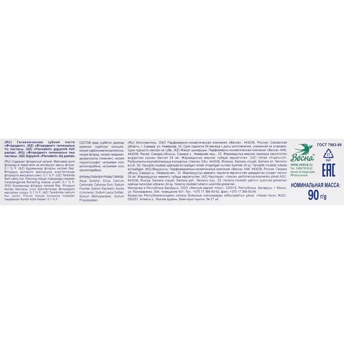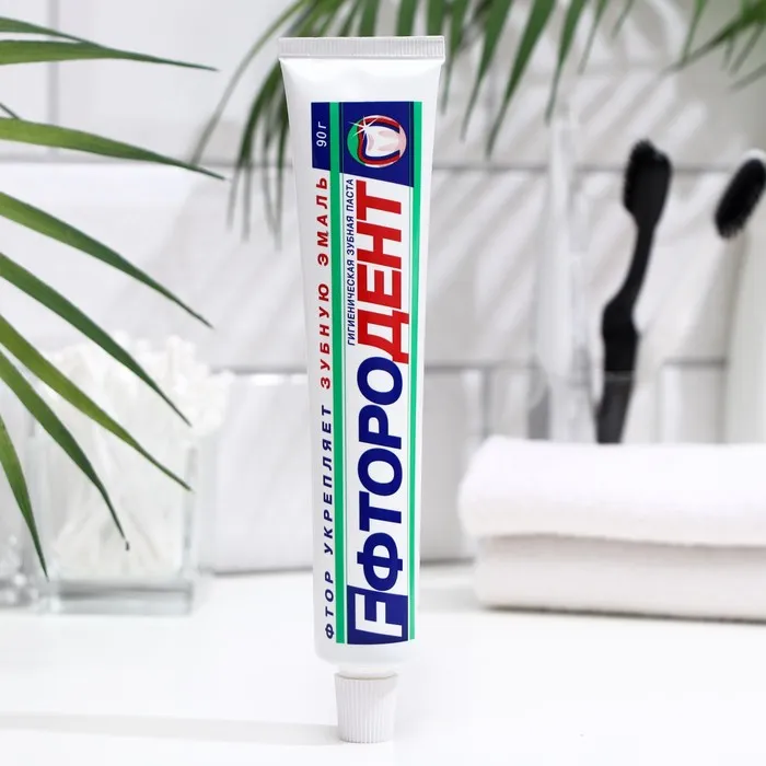 Описание: зубная паста Весна Фтородент. Зубная паста с фтором разработана специально для укрепления зубной эмали. Фтор в составе зубной пасты встраивается в структуру эмали и делает ее нерастворимой под действием кислот. Кроме того бактерицидный эффект фтора способствует предотвращению кариеса. За счет соединений фтора в зубной пасте бактерии менее активно генерируют опасные кислоты способствующие разрушению эмали зубов. Антибактериальные компоненты Зубной пасты предотвращают воспаление десен и заболевания полости рта. Благодаря мягкому чистящему составу Зубная паста не мягко полирует, очищает зубной налет и не разрушает эмаль. Легкий мятный привкус Зубной пасты Весна Фтородент освежает дыхание в течение долгого времени. С Зубной пастой Весна Фтородент вы легко сохраните десны здоровыми, зубы крепкими, а улыбку белоснежной!