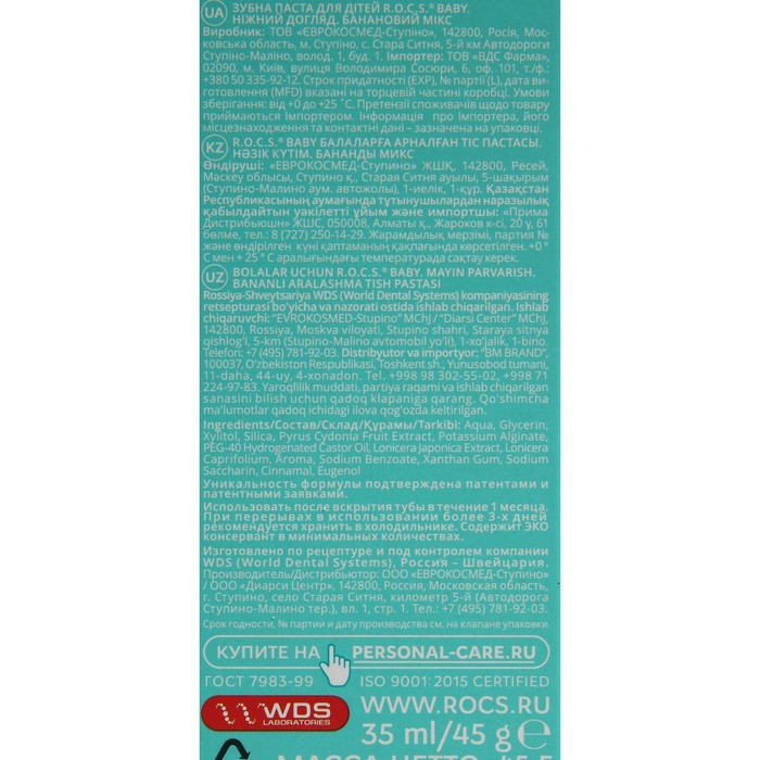 Уникальная зубная паста разработана специально для деликатного ухода за полостью рта малышей, начиная с первых месяцев жизни. Она изготовлена на основе природных компонентов, а натуральный ароматизатор придает пасте сладкий вкус банана, который понравится ребенку и сделает ежедневную гигиену ротовой полости приятной.