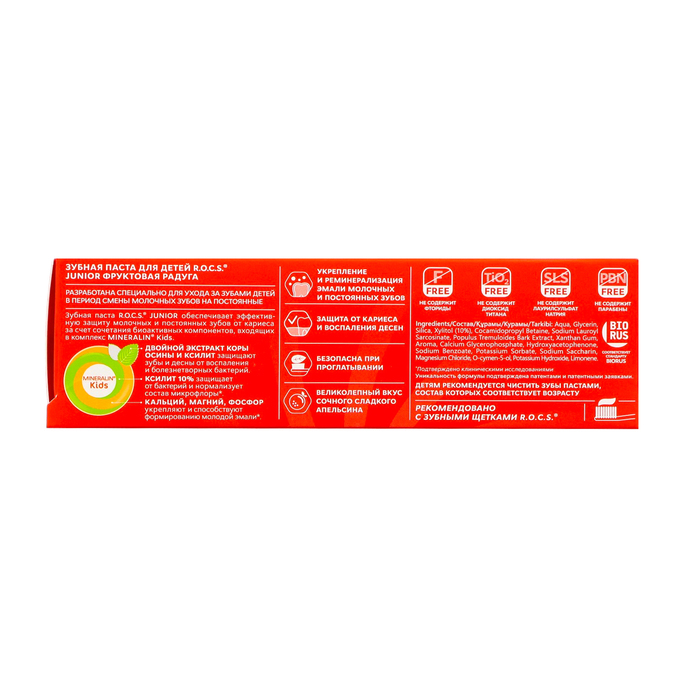 Минеральный комплекс (кальций, фосфор и магний) эффективно защищает от кариеса, укрепляет эмаль и усиливает блеск и белизну молодой эмали. Подтверждено клиническими исследованиями. Кальция глицерофосфат и магния хлорид активно поддерживают процесс реминерализации зубов, повышают резистентность эмали к действию кислот и механическую прочность эмали, обогащают слюну минеральными компонентами. Процесс прорезывания зубов сопряжён с существенной потерей минеральных компонентов, поэтому прорезавшийся зуб нуждается в активной реминерализации и восполнении уровня кальция и фосфора на всех участках. Преимуществом минерализующих систем R.O.C.S. является способность встраиваться в естественный физиологический процесс минерализации.