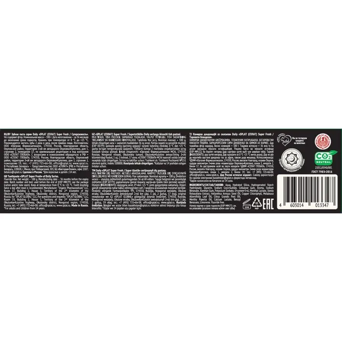 Входящие в состав зубной пасты SPLAT DAILY SUPER FRESH эфирное масло чайного дерева и лактат кальция оказывают реминерализирующее и противокариесное действие.