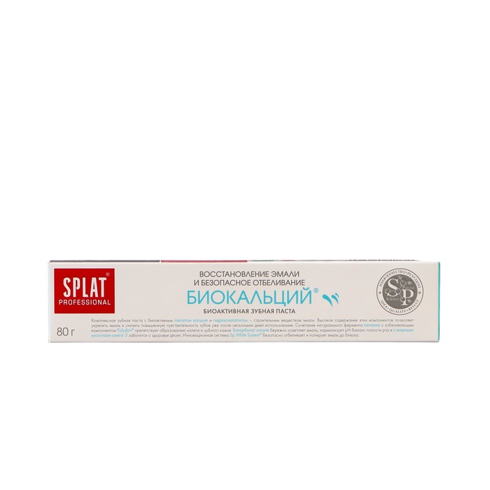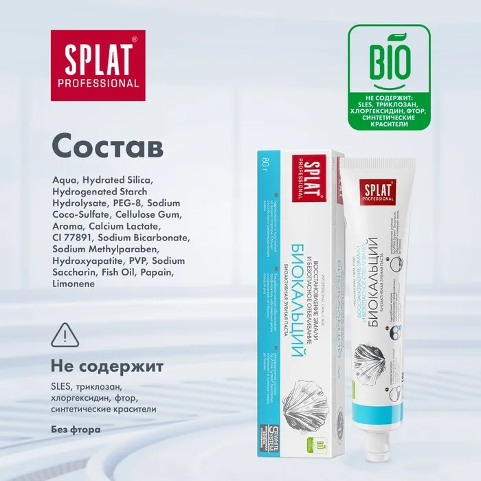 Формула зубной пасты Splat Professional "Биокальций" также включает в себя фторид натрия, который укрепляет эмаль и предотвращает развитие кариеса. Она также помогает в борьбе с зубным налетом и освежает дыхание, создавая ощущение свежести во рту.