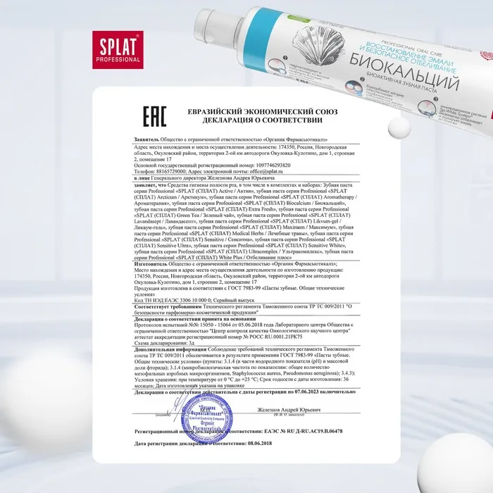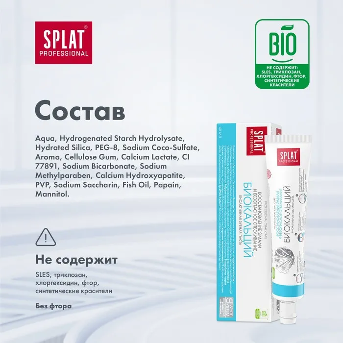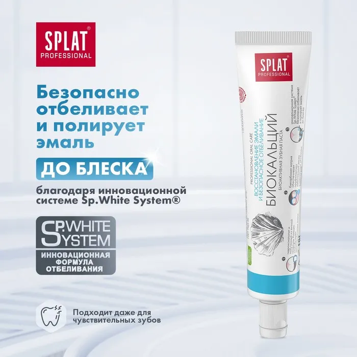 Паста Splat Professional Compact «Биокальций» укрепляет эмаль и снижает повышенную чувствительность зубов уже после нескольких дней использования. Она насыщает природным кальцием повреждённые зоны на начальных стадиях кариеса.