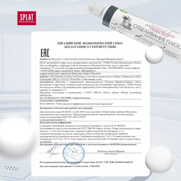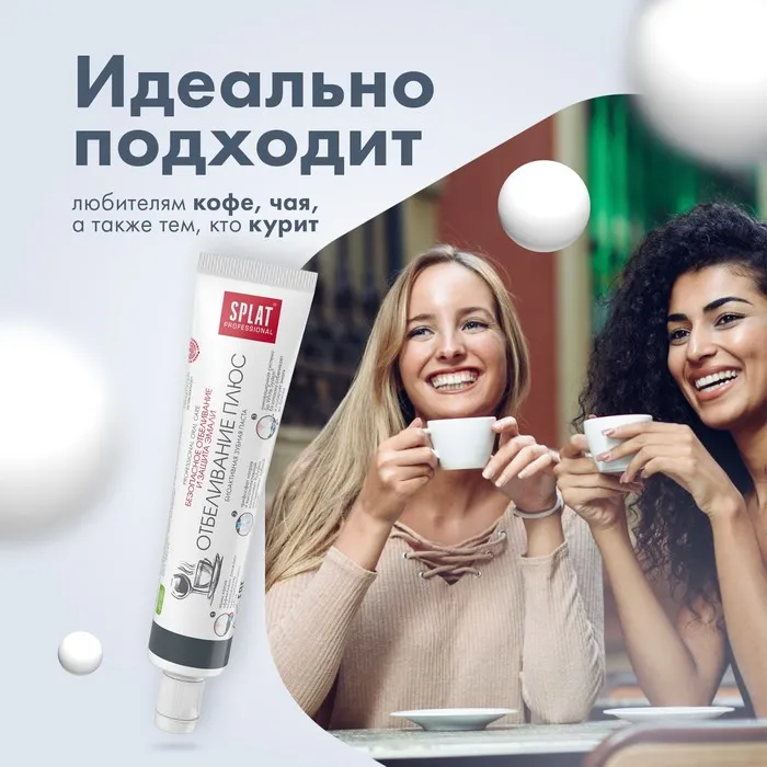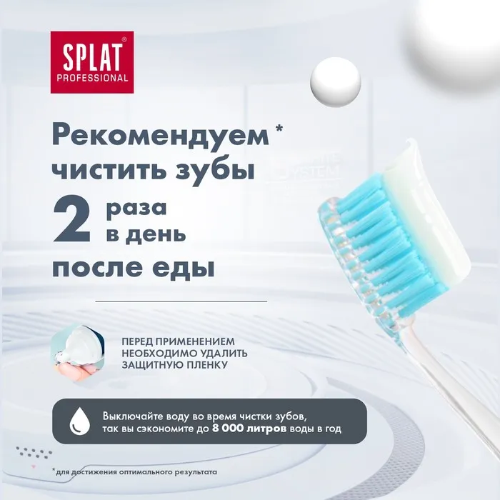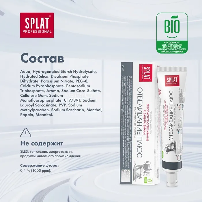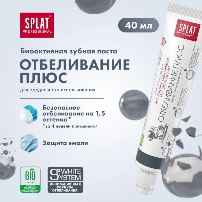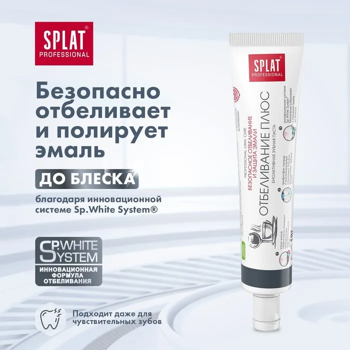 Зубная паста SPLAT Professional «Отбеливание Плюс» (WHITE PLUS) со фтором ухаживает за зубами и безопасно отбеливает их благодаря уникальному чистящему комплексу Sp.White System. Натуральный фермент папаин и высокомолекулярный отбеливающий компонент полидон эффективно расщепляют налет, способствуют сохранению белизны. Ионы калия снижают повышенную чувствительность зубов. Фторид-ионы эффективно защищают от кариеса.