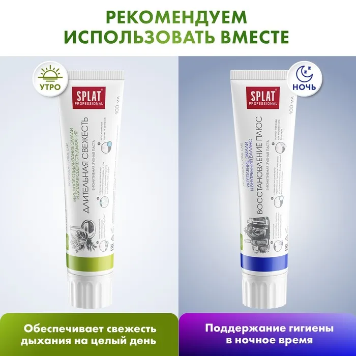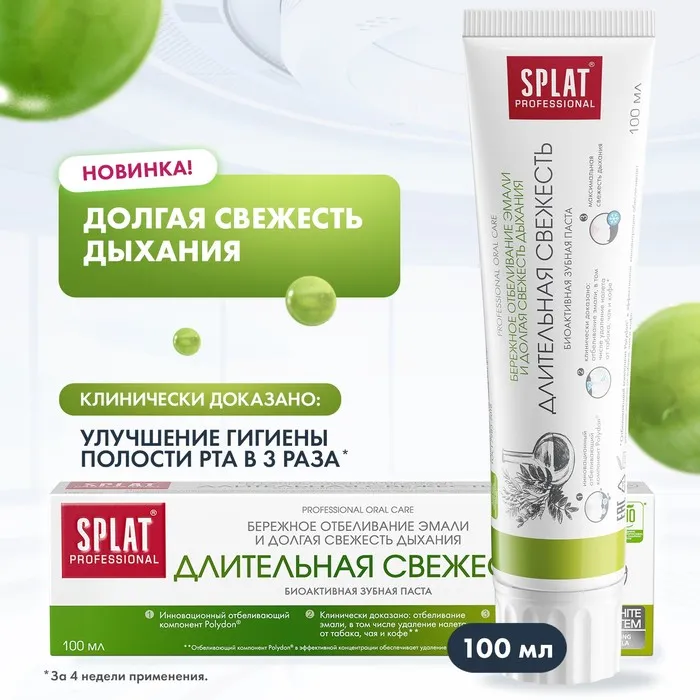 Зубная паста Splat Professional "Длительная свежесть" - это специальное средство для ухода за полостью рта, которое обеспечивает длительное ощущение свежести. Она содержит натуральные экстракты мяты и эвкалипта, которые придают пасте приятный вкус и аромат.