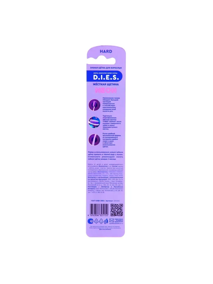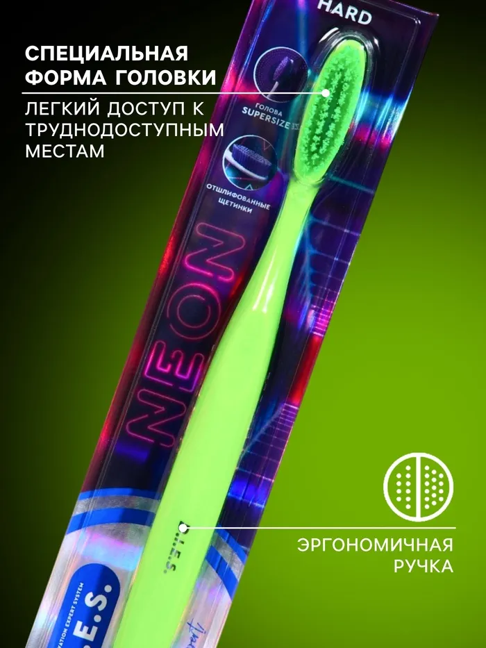 Зубная щетка высокой жесткости быстро удаляет зубной налет и деликатно отбеливает эмаль. Специальная форма головки облегчает доступ к дальним жевательным зубам.Зубная щетка D.I.E.S. NEON – отличный выбор для комплексного ухода за полостью рта.