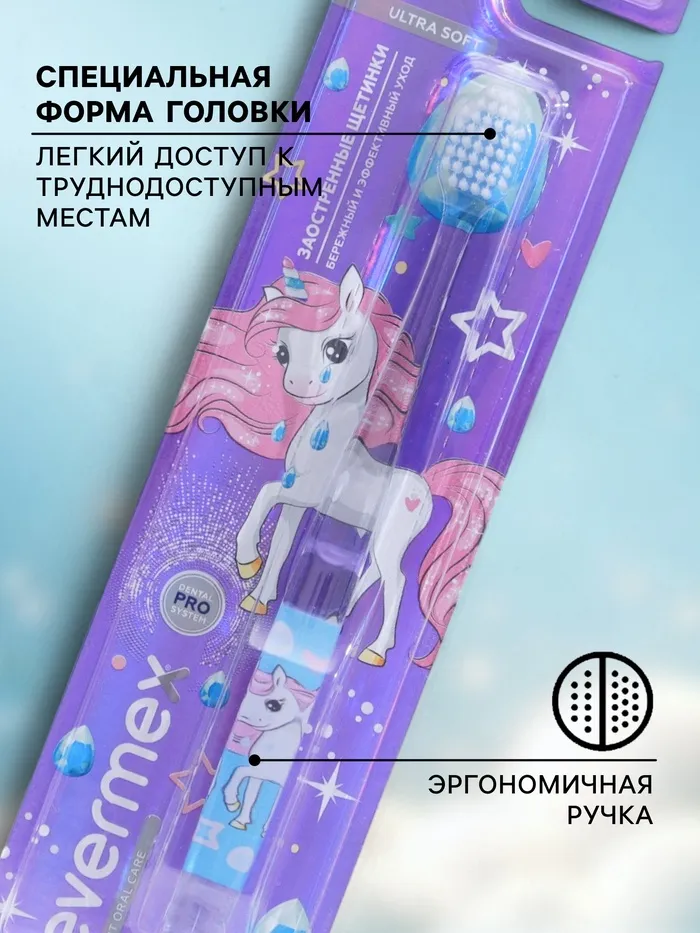 Зубная щетка для детей Evermex с единорогом и мягкой щетиной - это специально разработанная щетка, которая помогает детям поддерживать хорошую гигиену полости рта и формировать правильные привычки заботы о зубах. Она обладает следующими особенностями:
