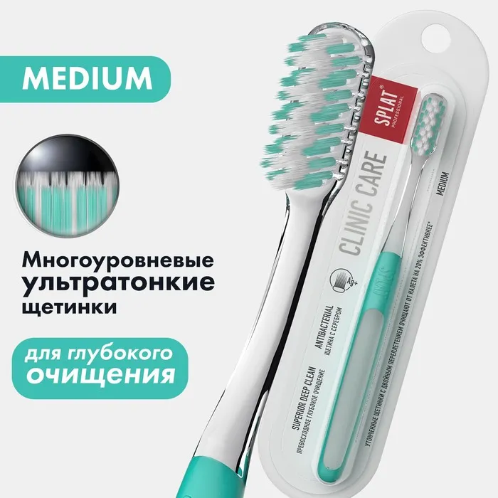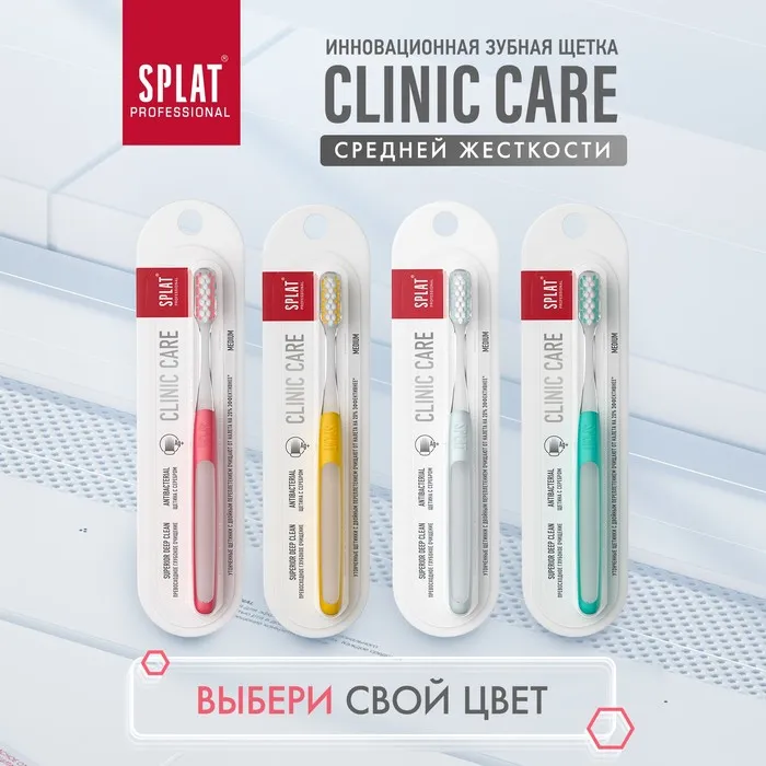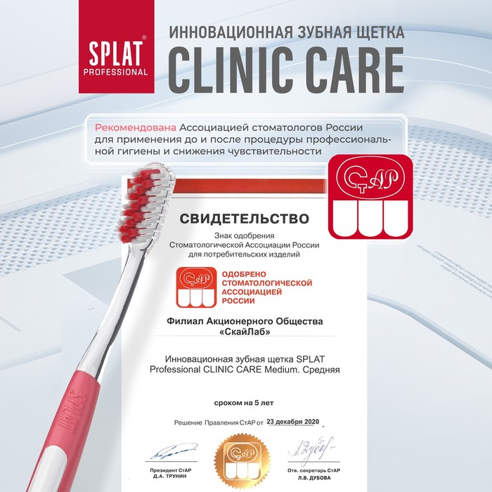 Зубная щетка Clinic Care от SPLAT® рекомендована Стоматологической ассоциацией России для ежедневного использования, а также до и после процедуры профгигиены.