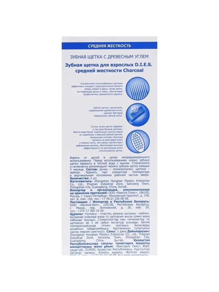 Зубная щётка D.I.E.S Charcoal, средней жёсткости, 1+1 шт., микс — Характеристики
