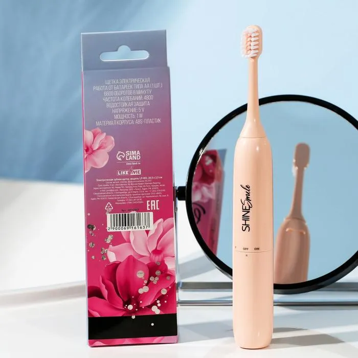 Электрическая зубная щётка предназначена для ежедневного ухода за зубами и полостью рта. Щётка нежно массирует дёсны и тщательно отчищает труднодоступные места. Чистка происходит за счёт вибрации, а не традиционного кручения головки щётки. В комплекте идут три насадки. Работает от батареек типа АА (1 шт.).