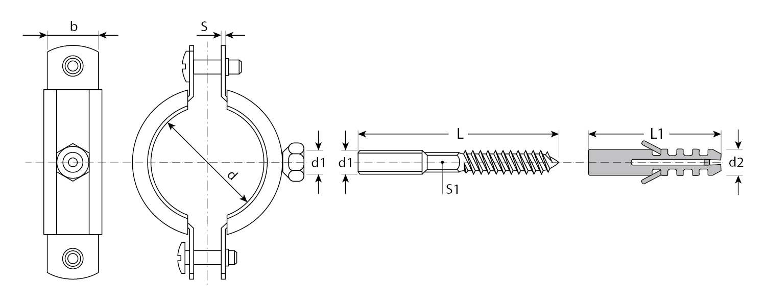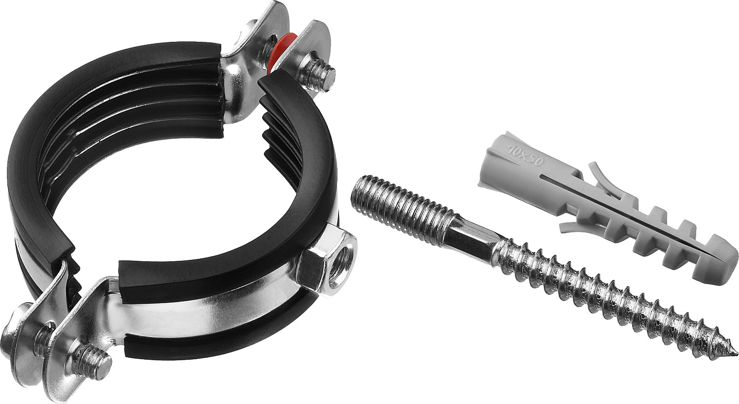 - Комплектность набора позволяет крепить хомут как с помощью гайки, так и с использованием шпильки и дюбеля