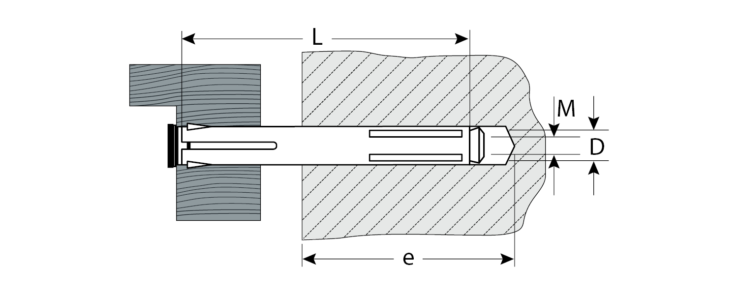 Для крепления оконных рам и дверных коробок к полнотелым основаниям: поверхностям из бетона, полнотелого кирпича или природного камня. Анкер устанавливается в предварительно просверленное и очищенное от буровой муки отверстие диаметром 10мм, расклинивание происходит при закручивании винта. Минимальная глубина сверления (е) - 50мм. Для установки анкера требуется бита PZ3.