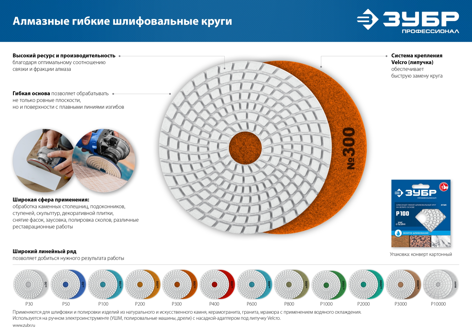 Для шлифовки и полировки изделий из натурального и искуственного камня, керамогранита, гранита, мрамора с применением водяного охлаждения. Используется на ручном электроинструменте (УШМ, полировальные машины, дрели) с насадкой адаптером под липучку Velcro.