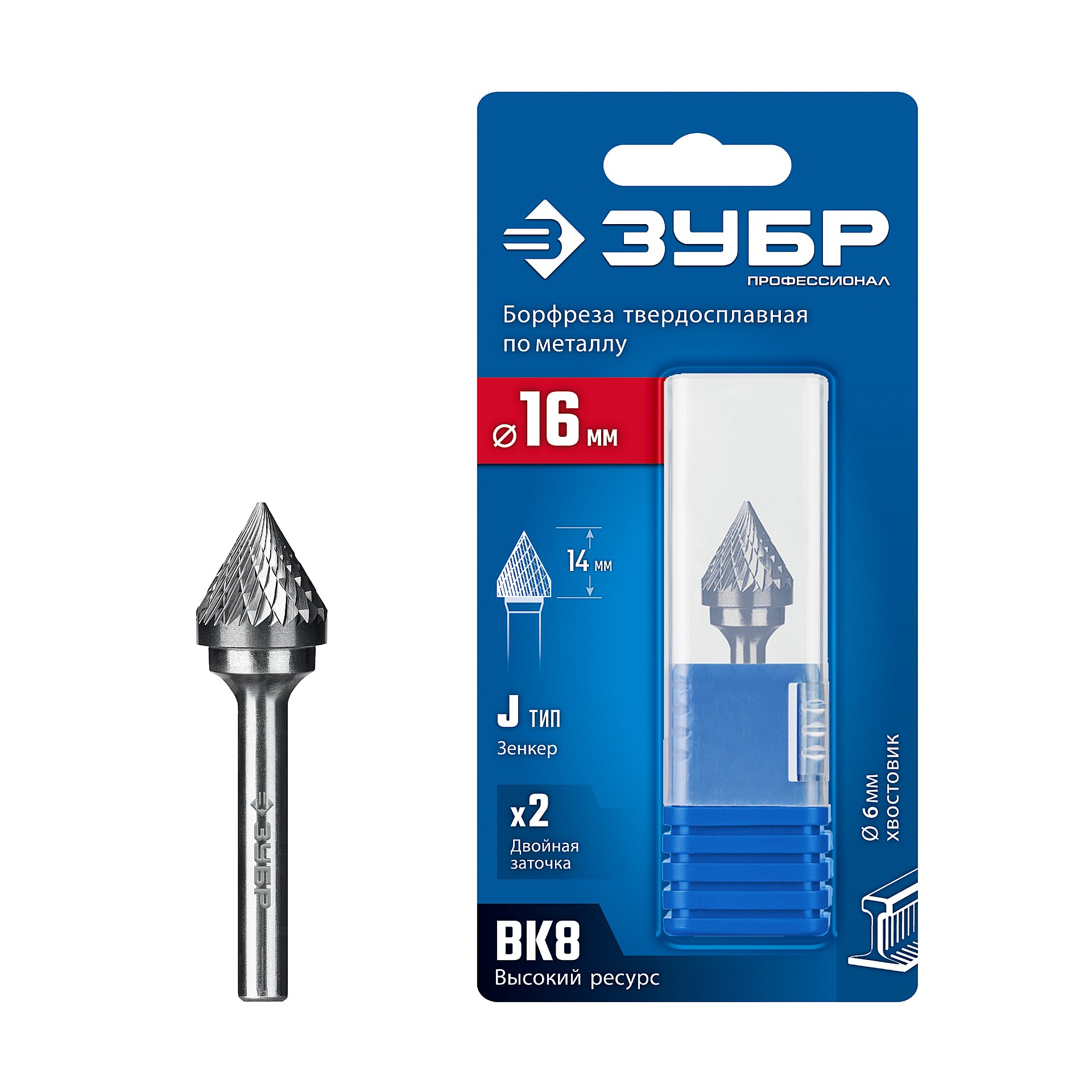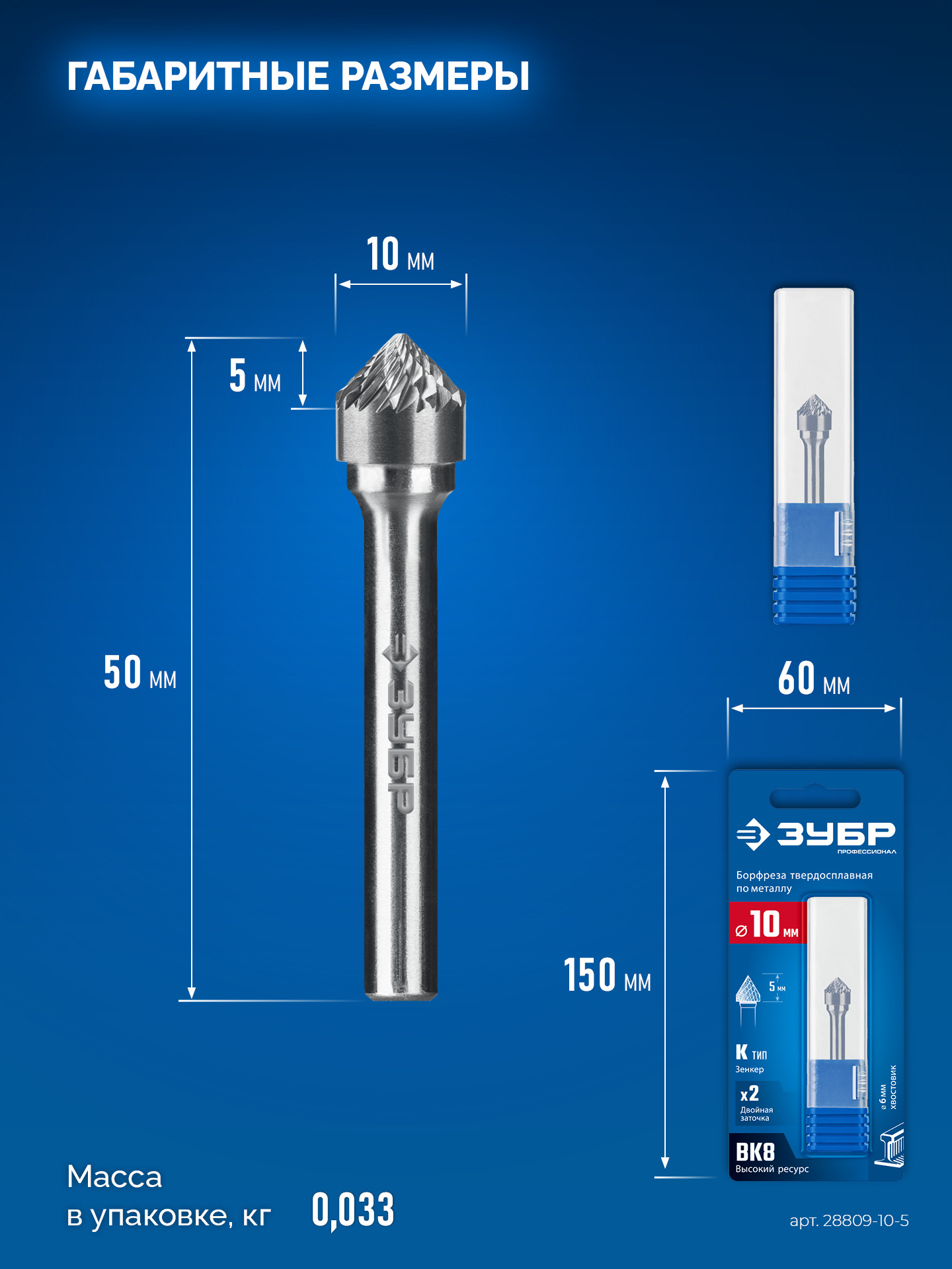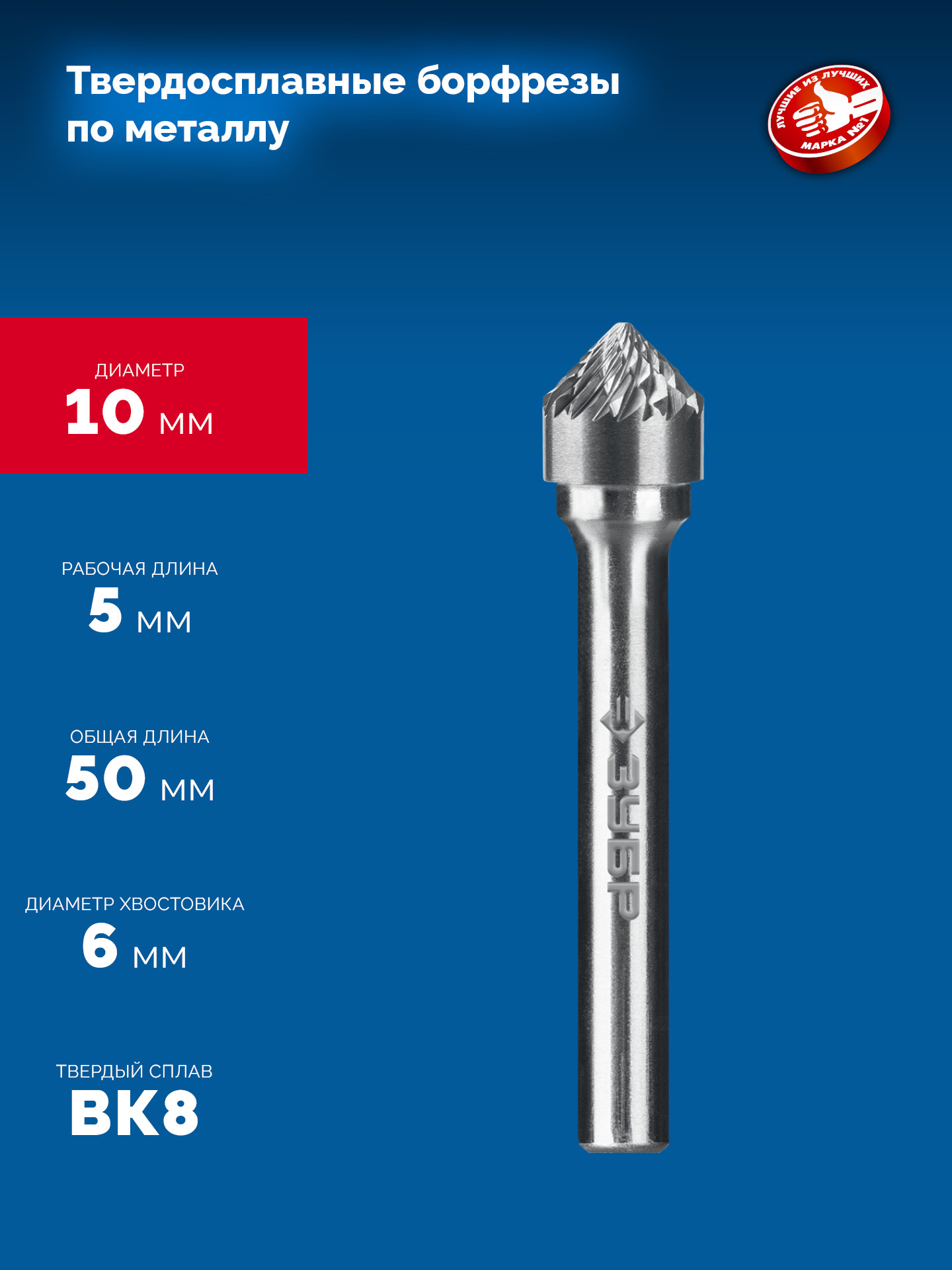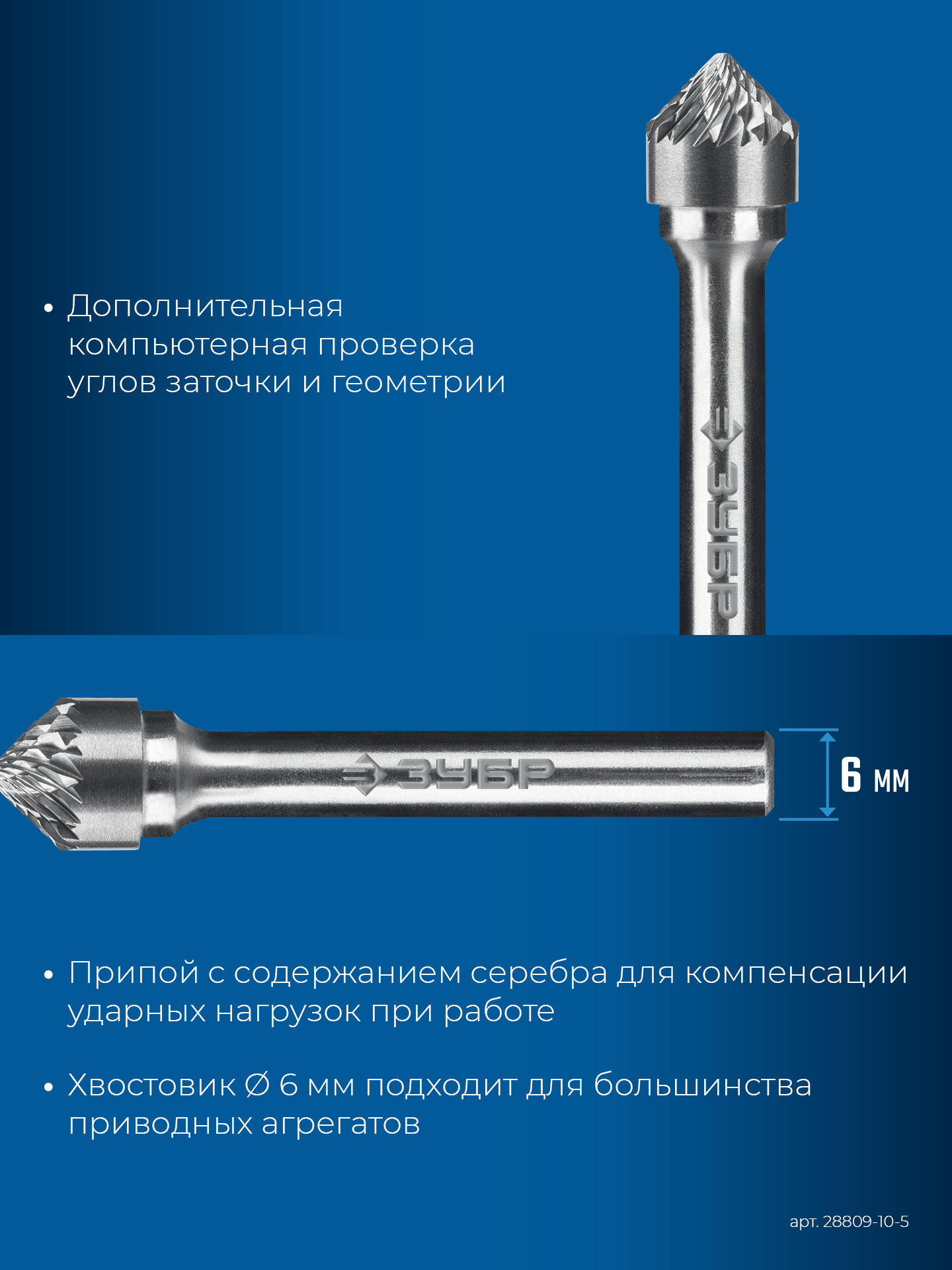 ЗУБР 10х5 мм, тип K (зенкер с вершиной 90°), хв-к 6 мм, твердосплавная борфреза, ПРОФЕССИОНАЛ (28809-10-5)