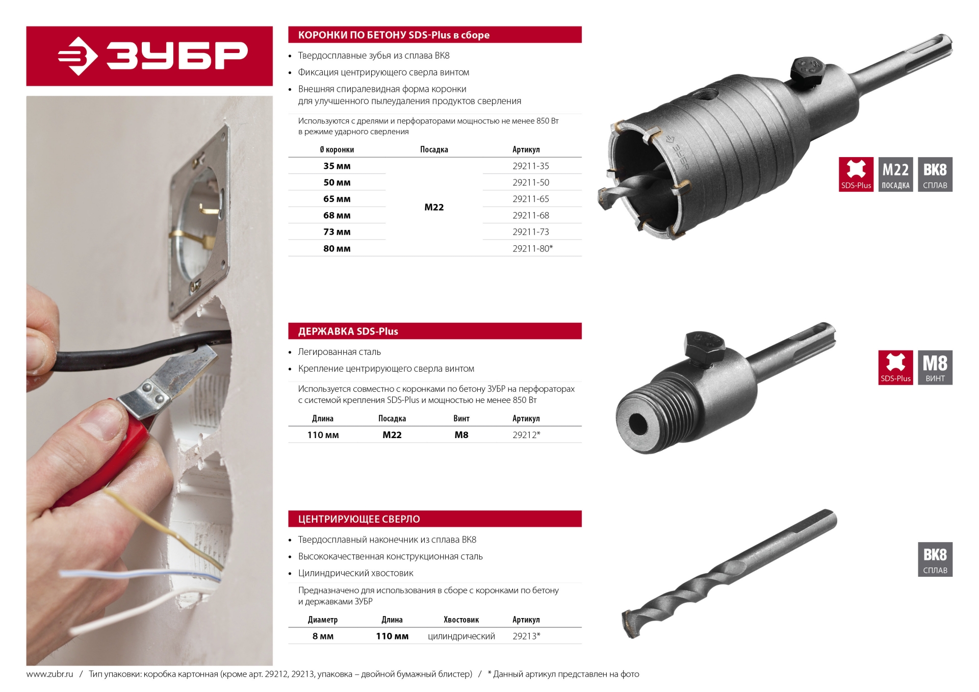 Коронки по бетону используются совместно с державками и центрирующими сверлами. Широкий ассортимент оснастки ЗУБР позволяет реализовать самые сложные задачи в работе по бетону, камню и кирпичу.