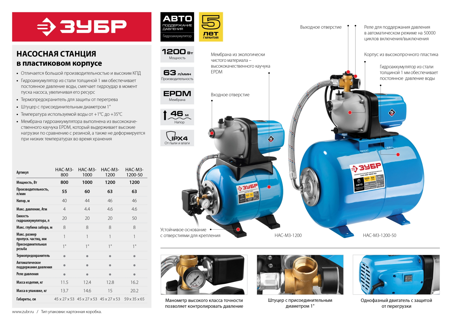 - Объем гидроаккумулятора 50 л обеспечивает полноценный водоразбор с более редкими включениями насоса, что продлевает срок его службы и способствует экономии электроэнергии