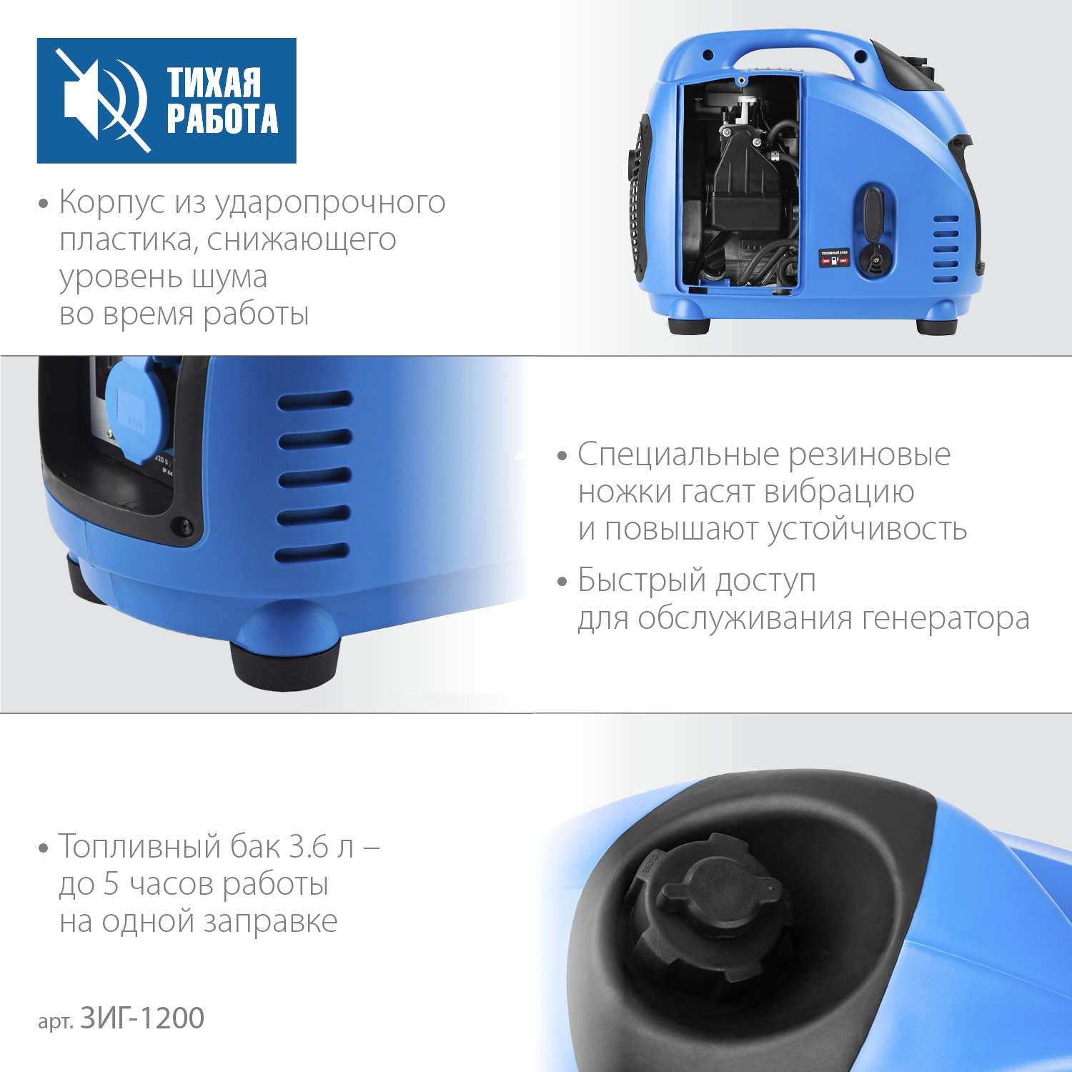 ДЛЯ КЕМПИНГА Компактный инверторный генератор мощностью 1.2 кВт. Отличный спутник в походе, на рыбалке, на отдыхе. Обеспечит питание и зарядку жизненно важных приборов. Идеальное качество вырабатываемого тока позволяет использовать станцию для питания любых электронных устройств без стабилизатора. Дополнительный выход на 12 В дает возможность подзарядки аккумуляторов.