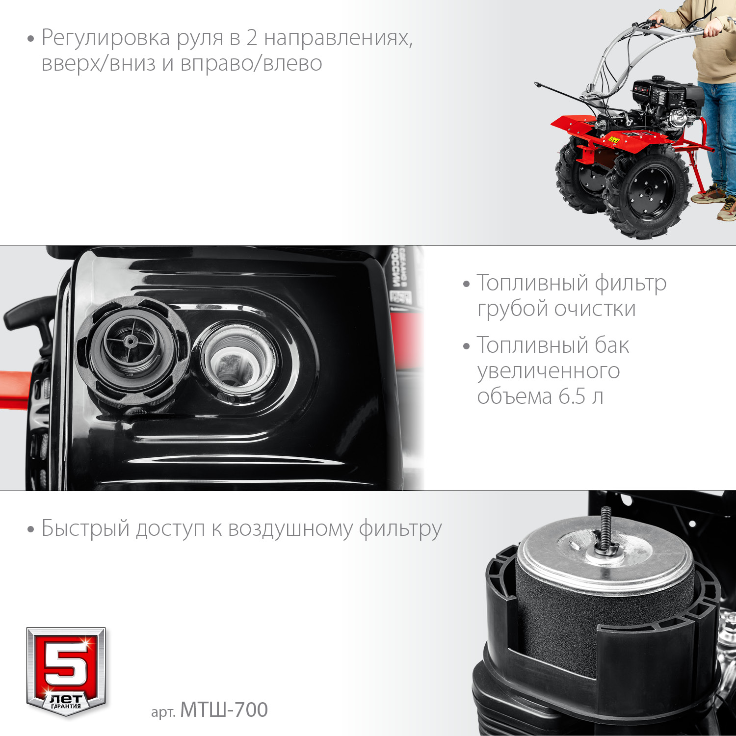• Рукоять мотоблока с возможностью регулировки по вертикали и горизонтали делает управление более комфортным