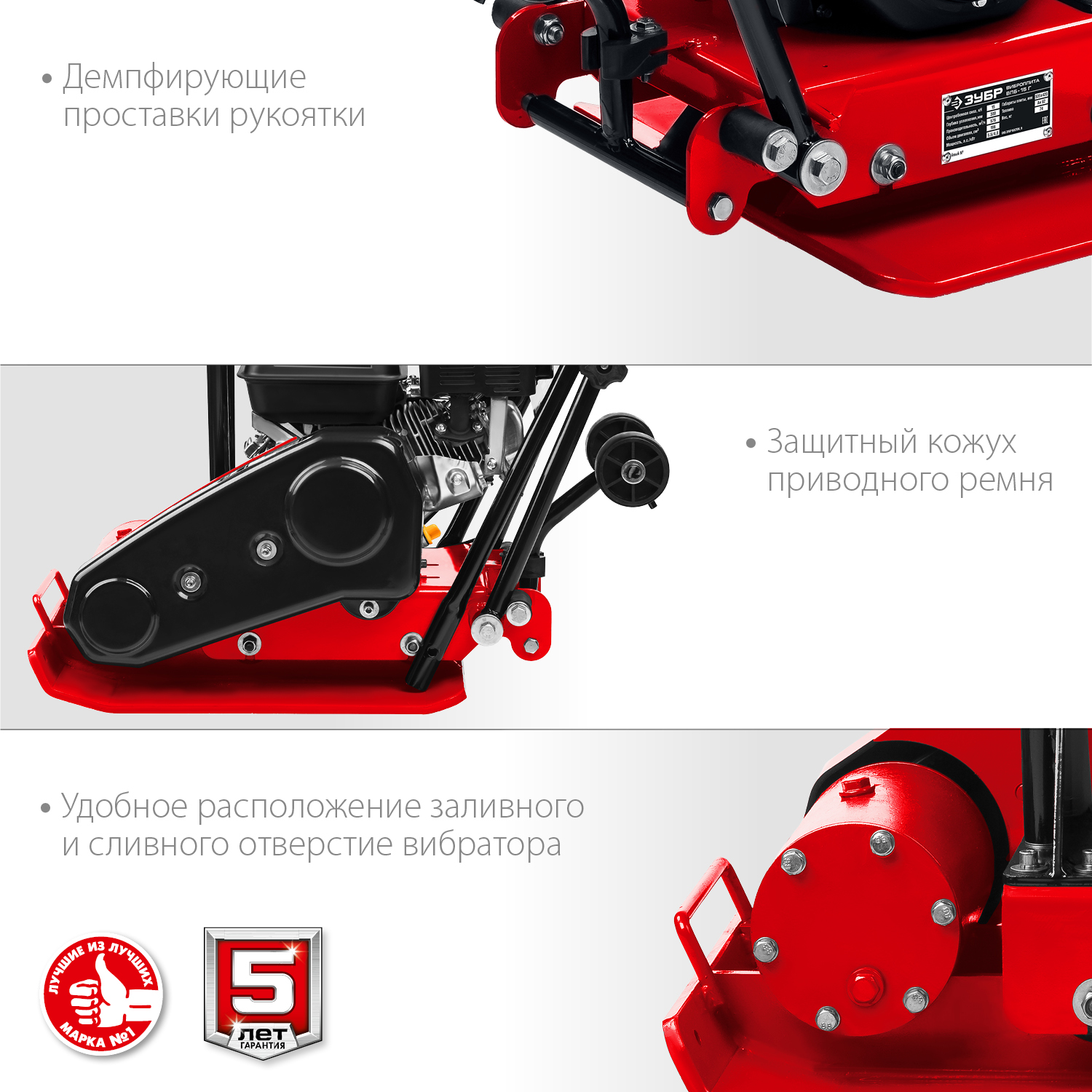 Виброплита предназначена для уплотнения бетонных, асфальтовых и сыпучих материалов, а также для формирования уплотненных поверхностей. Компактная конструкция позволяет осуществлять уплотнение смешанного грунта в самых узких местах, даже в очень узких траншеях. Направляющая рукоятка с виброзащитой позволяет увеличить количество часов непрерывной работы и снизить усталость для оператора. Четырехтактный двигатель ″ЗУБР″ обеспечит беспроблемную эксплуатацию при минимальном сервисном обслуживании на весь срок использования.