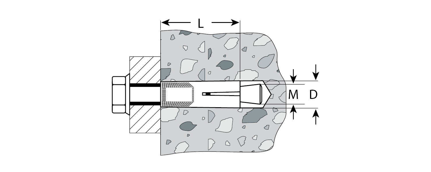 Для монтажа конструкций к полнотелым основаниям: поверхностям из бетона, полнотелого кирпича или природного камня. Анкер устанавливается в предварительно просверленное и очищенное от буровой муки отверстие и расклинивается при закручивании болта