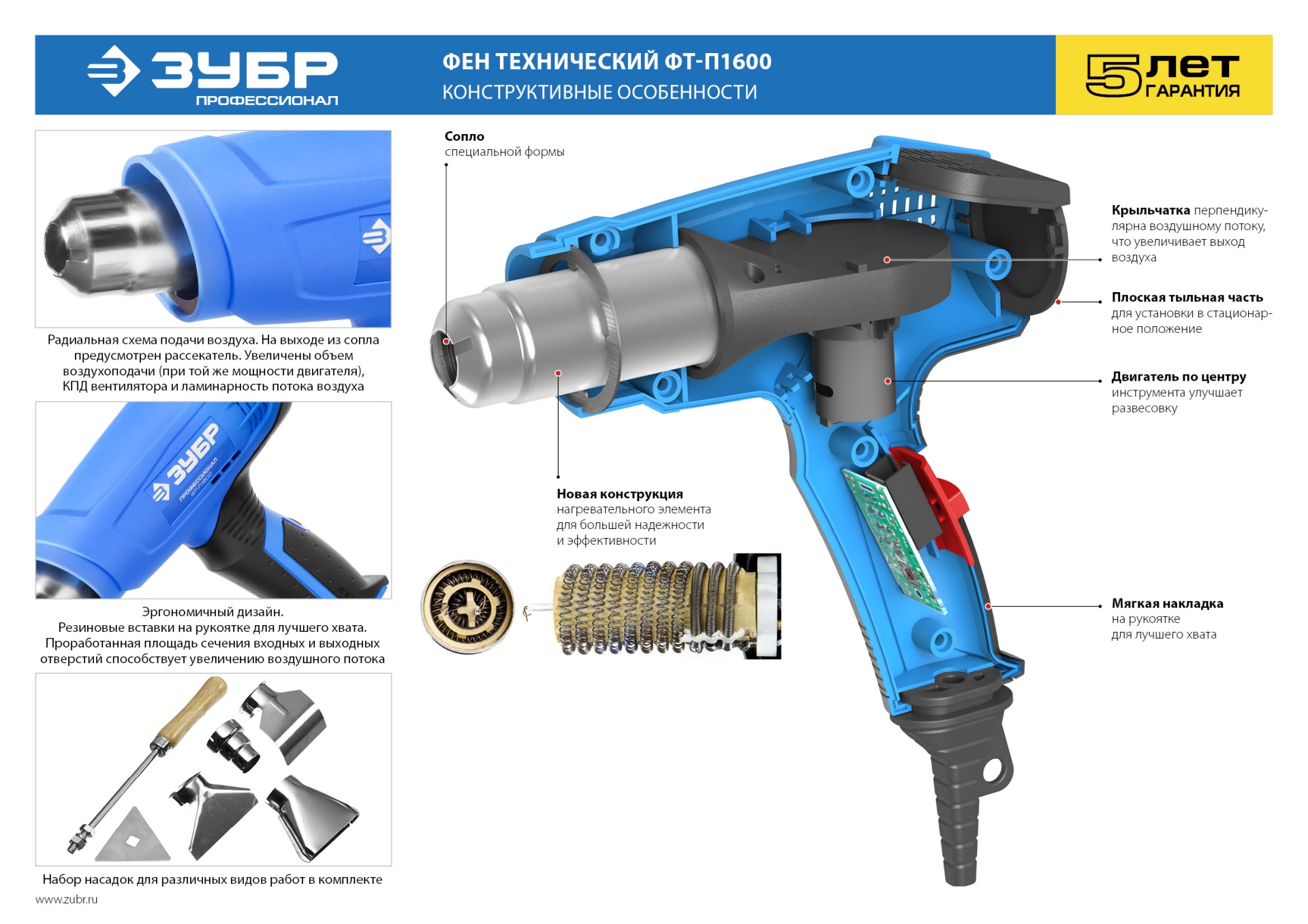 - 4 различные насадки в комплекте позволяют выполнять любую работу – от точечного нагрева до сушки больших площадей
