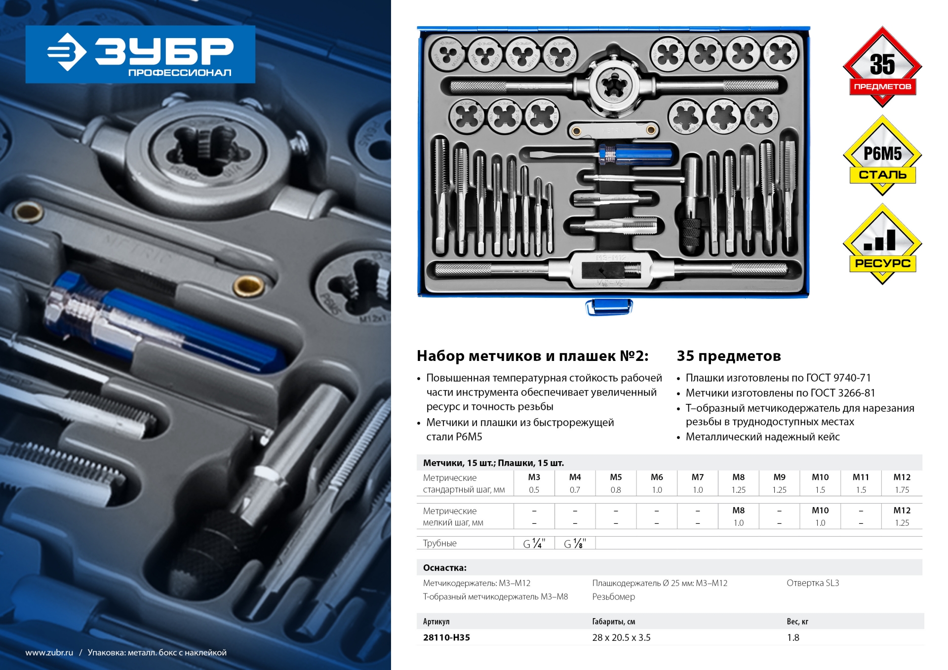 Набор предназначен для нарезания и калибрования внутренней и внешней метрической и трубной резьбы в сквозных и глухих отверстиях в сталях с пределом прочности до 900Н/мм2, цветных металлах, пластике.