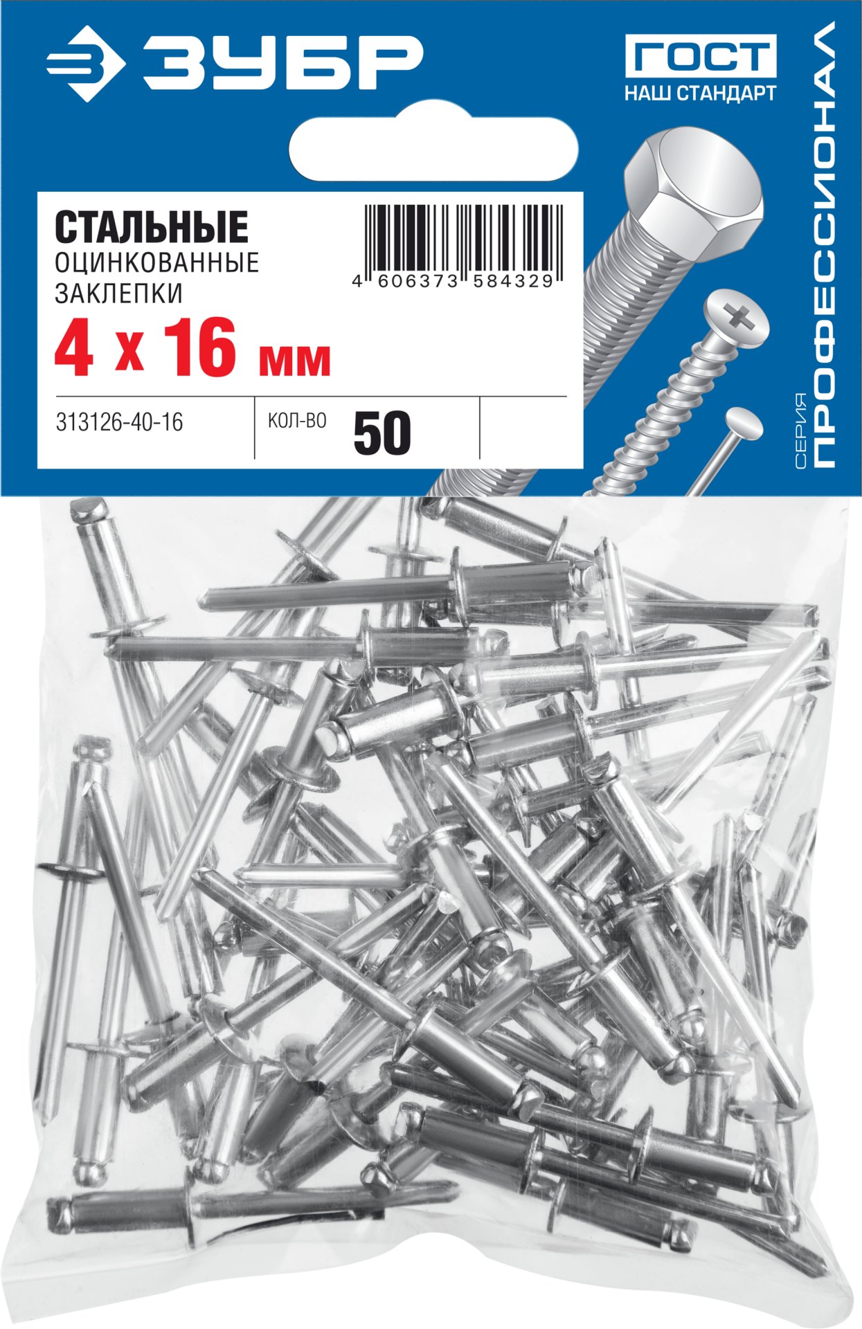 ЗУБР 4.0 х 16 мм, стальные заклепки, 50 шт, ПРОФЕССИОНАЛ (313126-40-16)