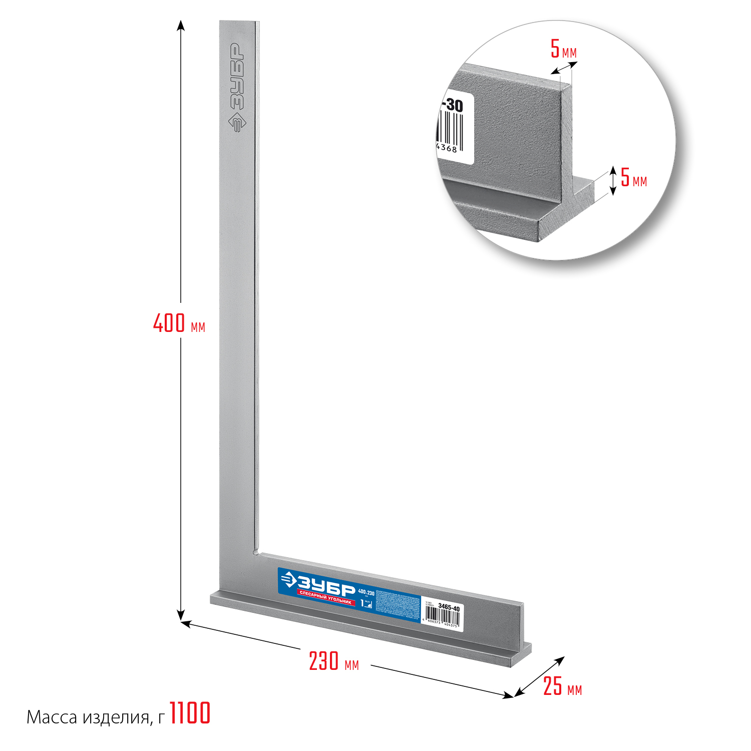 Мощный профессиональный цельнометаллический угольник со стальным полотном толщиной 5 мм и широким основанием.