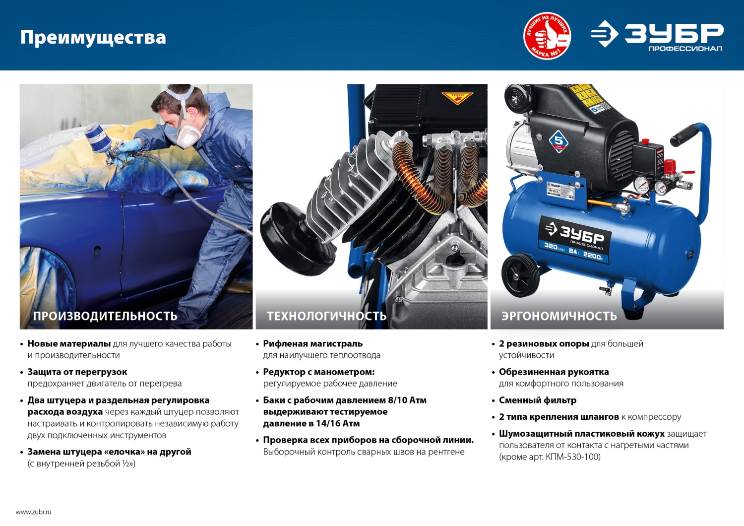 Грамотное сочетание новых технологий и проверенных временем конструкционных решений, которое найдет свое применение в мастерской, на производстве и в строительстве. Серия «Профессионал» отличается увеличенным ресурсомвозможность подключения двух инструментов, раздельно регулировать расход воздуха через каждый и автоматический режим работы изделия. Высокая производительность, возможность подключения двух инструментов, раздельная регулировка расхода воздуха через каждый позволяет подключать большой ассортимент пневмоинструмента. При правильной эксплуатации в соответствии с рекомендациями производителя ресурс данных компрессоров составит не менее 4000 часов*. * на основании результатов испытаний лаборатории компании АО «ЗУБР ОВК»