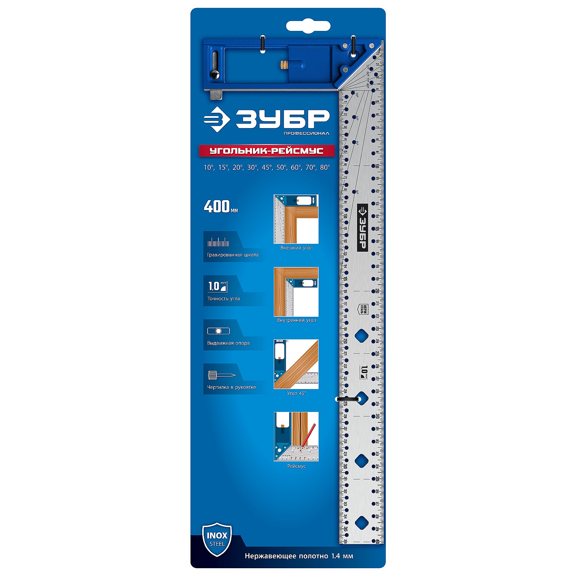 Усиленный профессиональный угольник-рейсмус с выдвижным упором. Используется для, проведения разметочных и замерочных работ. Отверстия в полотне позволяют размечать как паралельные линии с шагом 5 мм, так и дополнительные углы от 10 до 80 градусов.