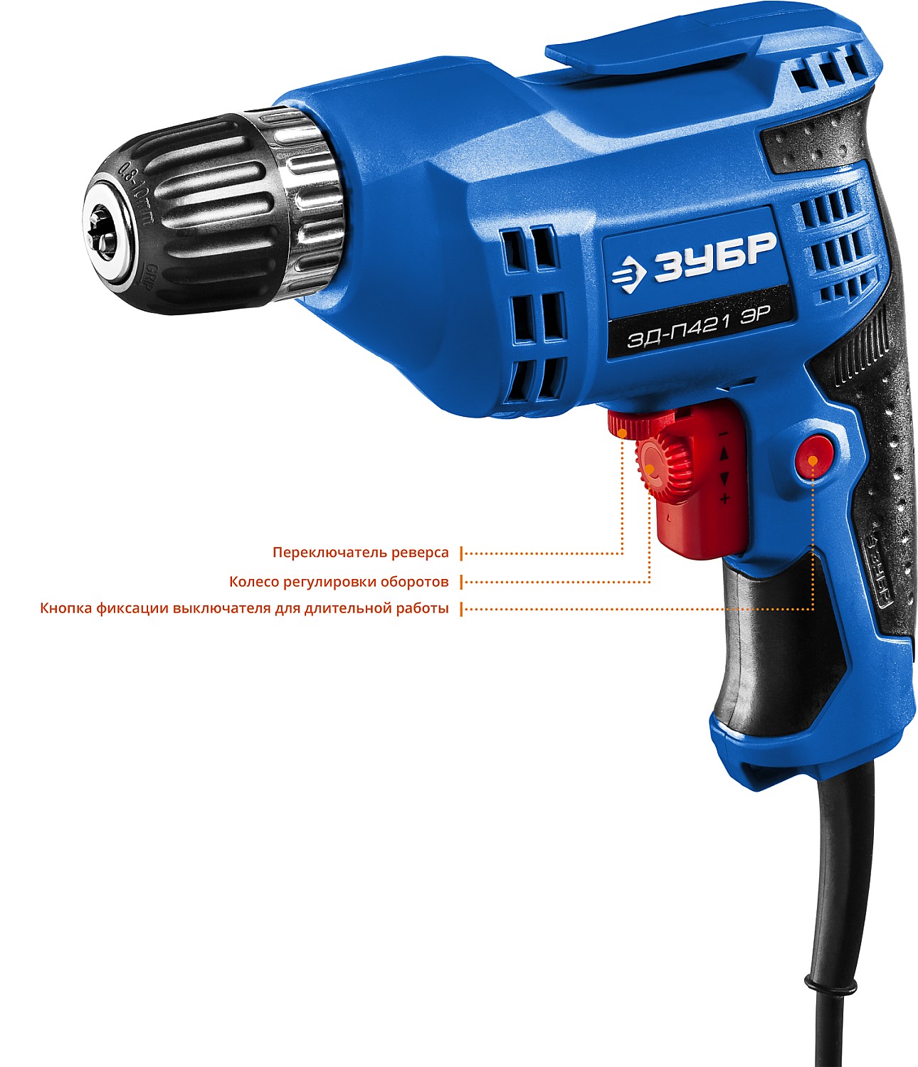 - Электронная регулировка оборотов от малых (для аккуратного засверливания) до высоких (для быстрого сверления)