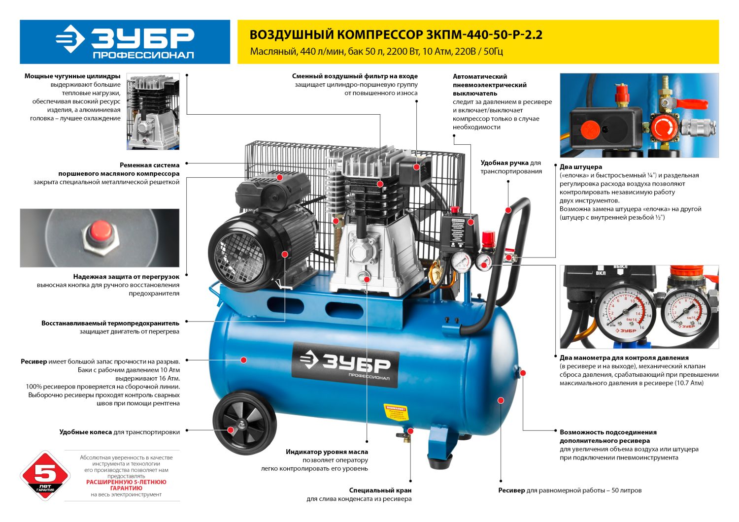 - Контроль давления в ресивере и на выходе при помощи двух манометров