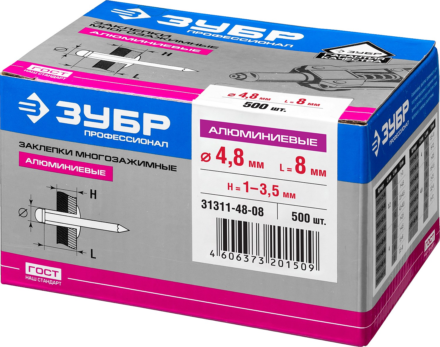 - Корпус заклепки изготовлен из специального алюминиевого сплава AlMg3, обладающего улучшенными механическими свойствами: высокая пластичность, повышенная коррозионная стойкость. Стержень заклепки изготовлен из оцинкованной стали.