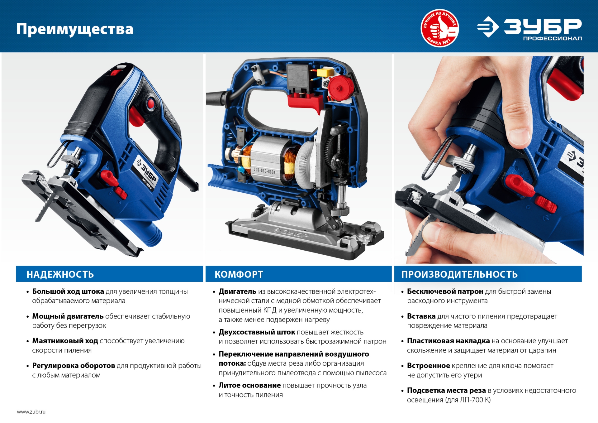 Профессиональный инструмент для всех видов пиления (прямого, наклонного, криволинейного) различных материалов (дерева, фанеры, пластика, металла) от тонких листов до досок толщиной 65 мм. Компактный и мощный, с удобным хватом и отличной маневренностью. Полезные ″мелочи″ вроде вставки для чистого пиления, легко скользящей накладки на основание, встроенного крепления ключа и переключения направлений обдува помогают работать комфортно и эффективно